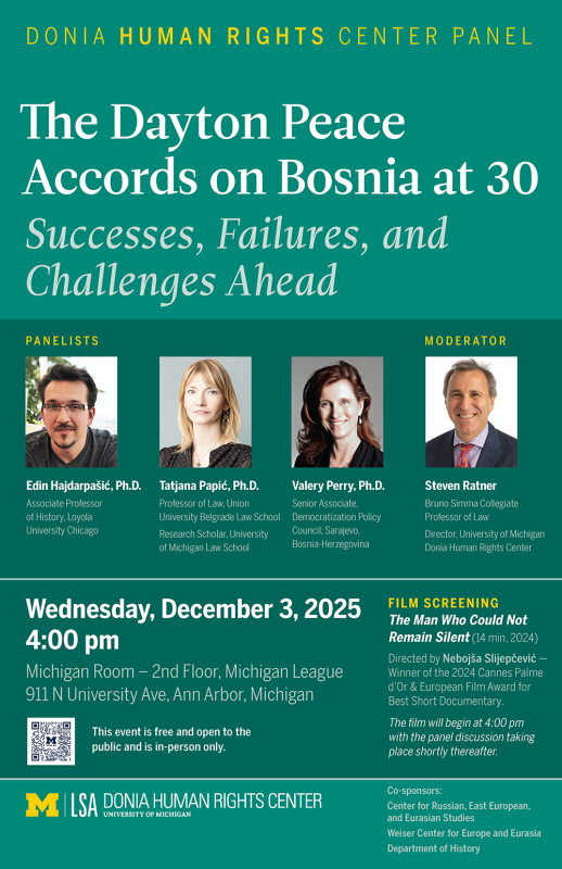 Thirty years after the signing in Dayton, Ohio, of the peace agreement ending the war in Bosnia, both Bosnia and its neighbors face immense challenges to respect for human rights and the rule of law. In this panel, experts from the region specializing will discuss the successes, failures, and future prospects for the region. The panel will be preceded by the showing of The Man Who Could Not Remain Silent, a film based on events during the Bosnia conflict and winner of the 2024 Cannes Film Festival Palme D’Or for Best Short Film.