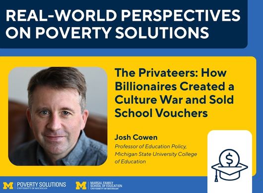 Open to everyone Josh Cowen | Professor of Education Policy, Michigan State University College of Education Cosponsored by the University of Michigan Marsal Family School of Education Add Cowen’s talk to Google Calendar >