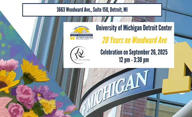 20 years on Woodward Ave! The UM Detroit Center is celebrating being in the heart of the city for 20 years, remaining dedicated to community, education, research and much more. Join us on September 26 to hear stories of how we started, where we are, and plans for the future. Enjoy refreshments, networking, and a performance curated by Detroit Dance Collective.