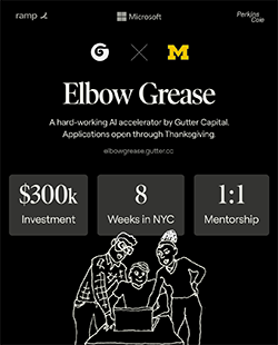 Elbow Grease is A Hard Working AI Accelerator in New York City. Gutter Capital is sponsoring this 8-week residency in Chinatown. Participants will receive a $300k investment, 1:1 mentorship from Series B+ and founders, off-the-record conversations with industry leaders, and practical workshops by elite startup operators. This residency is suggested for entrepreneurial students and alumni at UMich who might be building with AI.