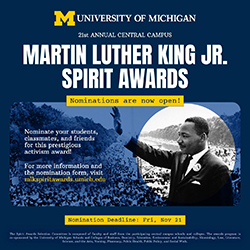 The Martin Luther King Jr. Spirit Awards Committee has announced a call for nominations for the 2026 Central Campus Rev. Dr. Martin Luther King Jr. Spirit Awards! Nominations are open to undergraduates, graduate students, and student groups on central campus.