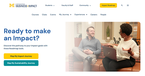 The Business+Impact Impact Roadmap (UMImpactRoadmap.com) provides you with a single location for all social impact on the U-M campus. Here you’ll find all of the events, courses, people, and key partners working to use their learning to make a real impact in the world.